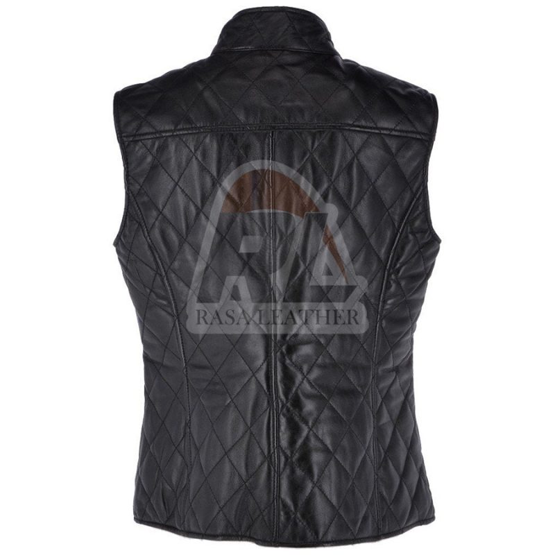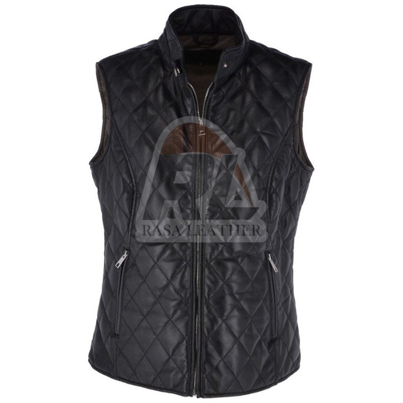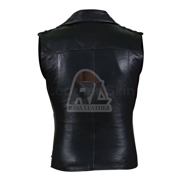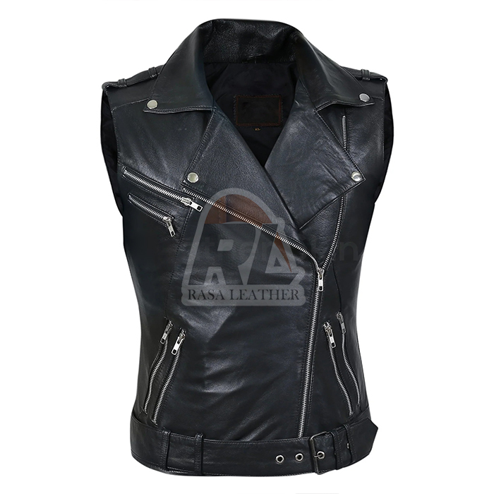Women Black Belted Motorcycle Leather Vest with Silver Zippers