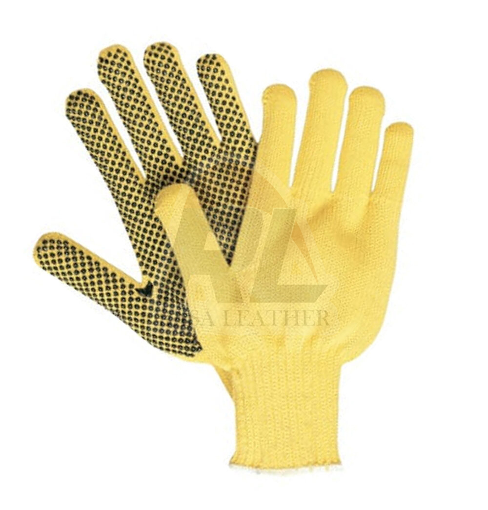 Seamless Knitting gloves made of Polyester Cotton Mix fabric. PVC dotted pasted on front palm for strong grip and durability.